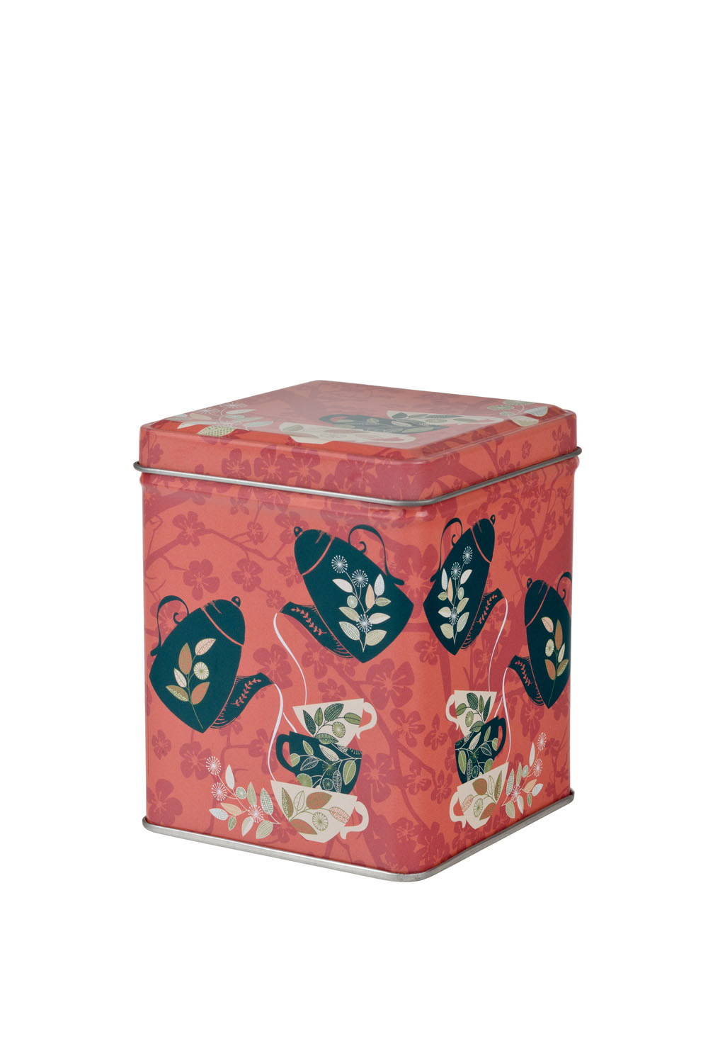 Plechová dóza na 100 g čaje nebo kávy. Rozměry: 7,5 x 7,5 x 9,5 cm.